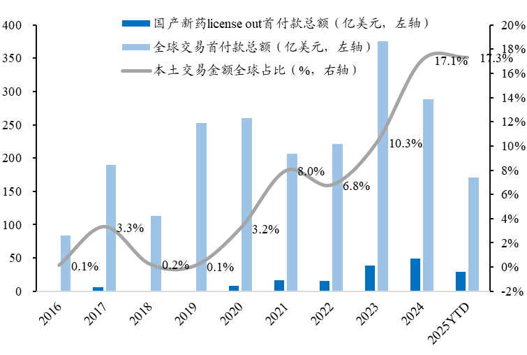 产业升级取得里程碑式突破,中国创新药企从技术追随者蜕变为全球创新贡献者。2024年中国创新药海外授权交易首付款总额达到57亿美元,占全球生物医药授权交易首付款比例的20%,标志着中国创新药进入全球价值链核心圈层。三生制药将PD-1/VEGF双抗SSGJ-707海外权益授权辉瑞,获得12.5亿美元首付款,创下中国双抗药物出海纪录;联邦制药将GLP-1创新药UBT251授权诺和诺德,首付款达2亿美元;和铂医药与阿斯利康达成技术平台合作,首付款及短期里程碑金额达1.75亿美元。这些标杆性交易不仅验证了中国创新药的国际竞争力,更重构了全球医药创新版图。商业化进程的提速进一步印证产业成熟度,2025年上半年国产1类新药获批数量创历史新高,TROP2 ADC、GLP-1受体激动剂、IL-4R抑制剂等重磅靶点药物集中上市,百济神州、信达生物等龙头企业研发费用率呈现下降拐点,昭示着行业从研发投入期向利润兑现期的关键跨越。