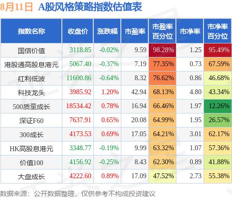 风格策略指数方面,国信价值的市盈率百分位较高,为98.28%。而大盘成长的市盈率百分位较低,为47.52%。