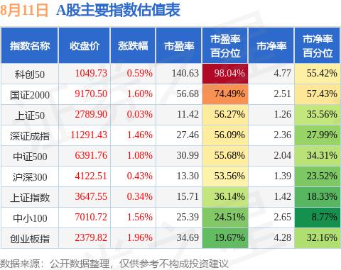 A股主要宽基指数方面,科创50的市盈率百分位较高,为98.04%。而创业板指的市盈率百分位较低,为19.67%。