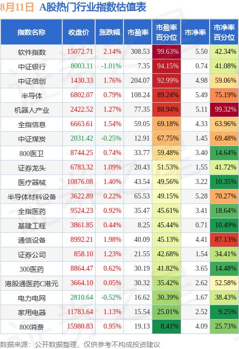 热门行业指数方面,软件指数的市盈率百分位较高,为99.63%。而800消费的市盈率百分位较低,为8.41%。