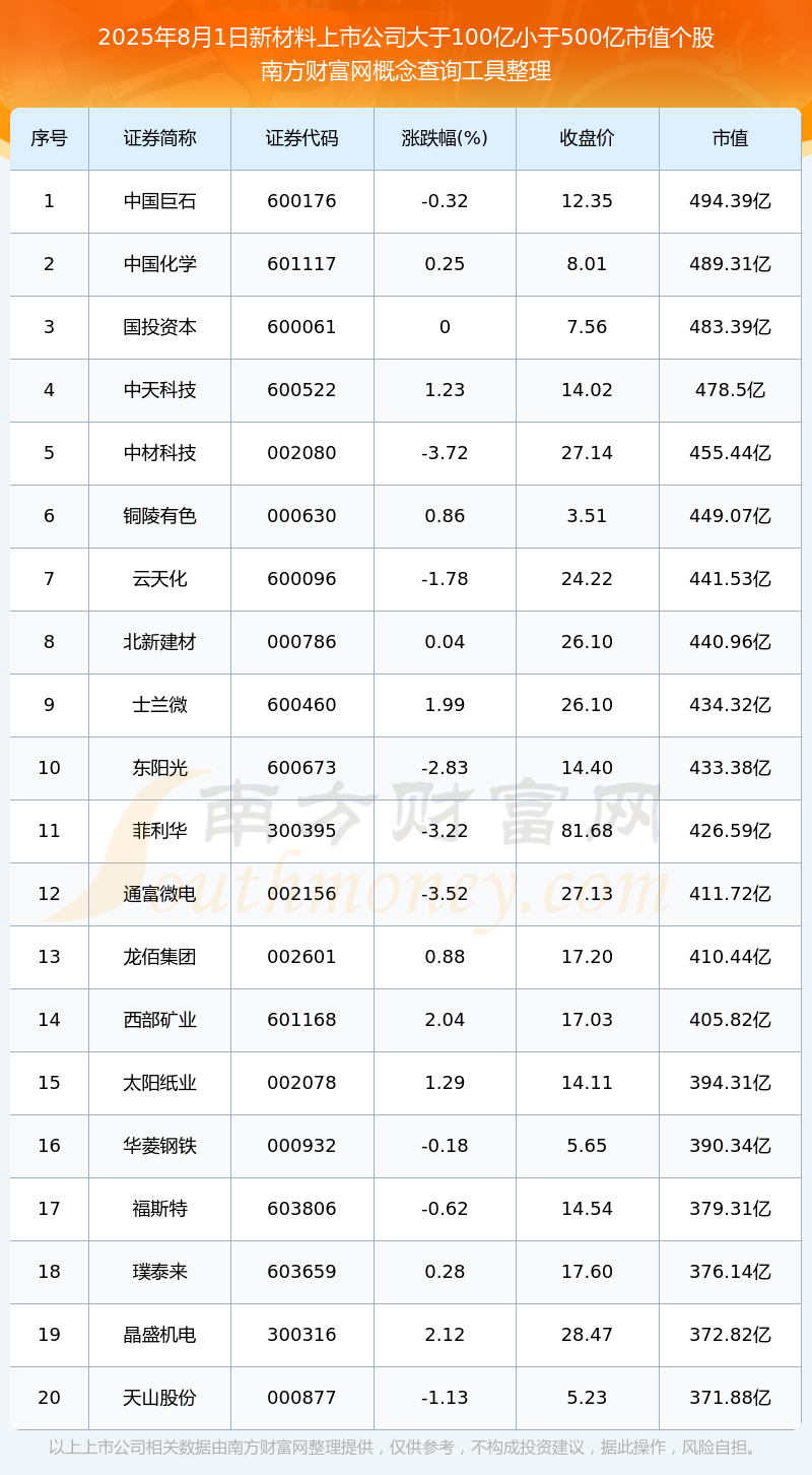 截止2025年8月1日,新材料上市公司市值大于100亿小于500亿的个股共有176只。其中,市值较高的有中国巨石、中国化学、国投资本,市值分别为494.39亿元、489.31亿元、483.39亿元。