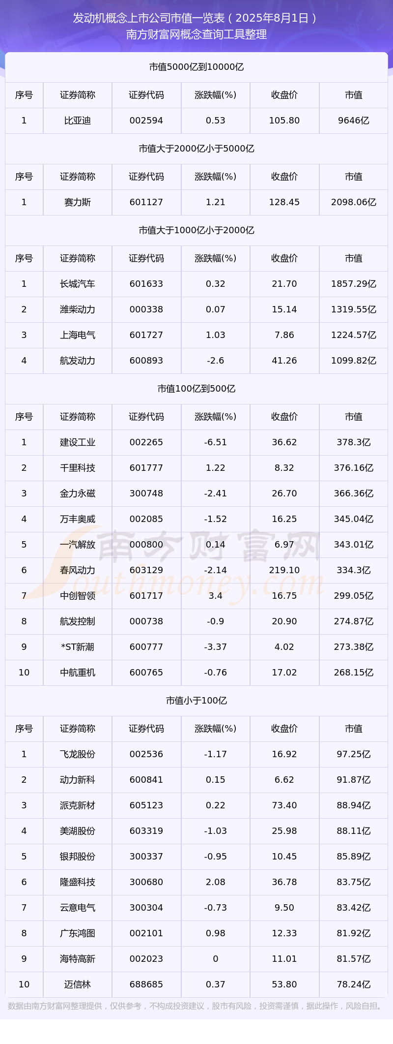截止2025年8月1日,发动机概念上市公司中飞龙股份、动力新科、派克新材、美湖股份等58家市值位于不足100亿之列;建设工业、千里科技、万丰奥威、一汽解放、春风动力等36家市值位于100亿到500亿之列;长城汽车、潍柴动力、上海电气、航发动力等4家市值位于1000亿到2000亿之列;赛力斯市值位于2000亿到5000亿之列;比亚迪市值位于5000亿到10000亿之列。