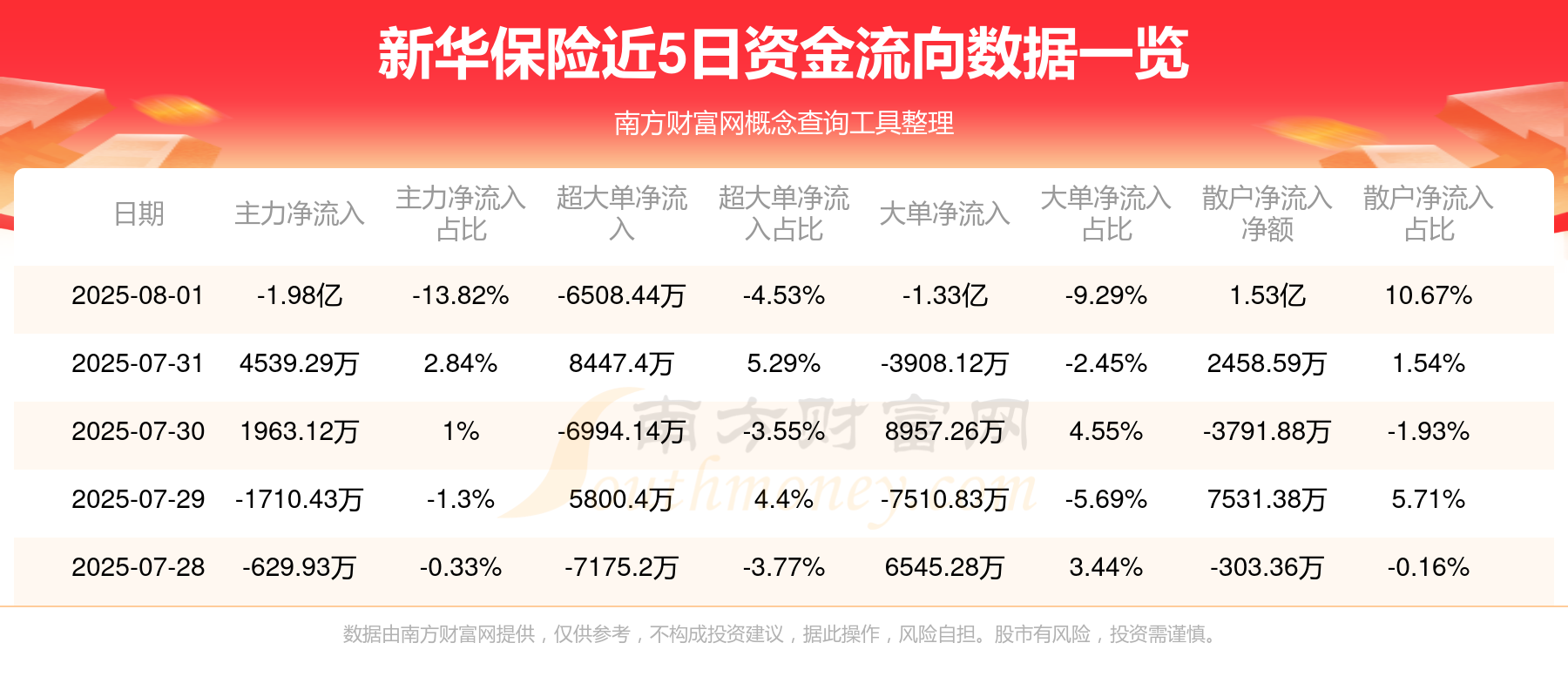 8月1日消息,新华保险主力净流出1.98亿元,超大单净流出6508.44万元,散户净流入1.53亿元。