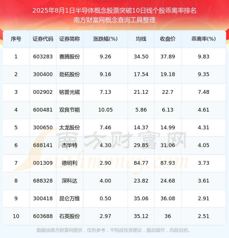 根据概念查询工具数据统计,截止2025年8月1日收盘,半导体概念股票共有64只个股收盘价向上突破了10日线。其中乖离率较大的个股有赛腾股份、劲拓股份、铭普光磁等,乖离率分别为9.83%、9.35%、7.48%。