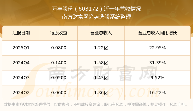 万丰股份(603172)披露2025年第一季度报告,报告期实现营收1.22亿元,同比22.95%;归母净利润1036.35万元,同比77.96%;扣非净利润1029.99万元,同比69.05%;基本每股收益0.08元。
