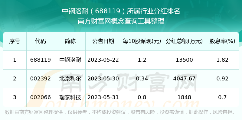按照趋势选股系统统计,中钢洛耐所属行业为耐火材料行业,耐火材料行业分红排名情况如下表: