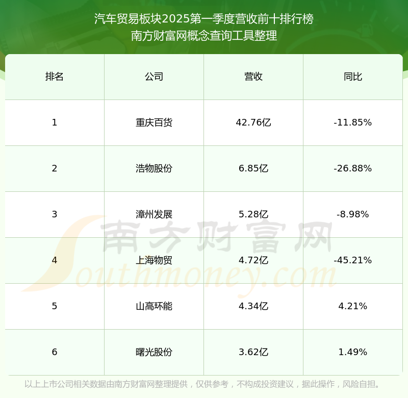 按照概念查询工具统计,该股所属板块为汽车贸易板块,该板块共有6只股票,国机汽车2025第一季度营收在该板块中排名为第6名,该板块2025第一季度营收排名前十的股票如下表: