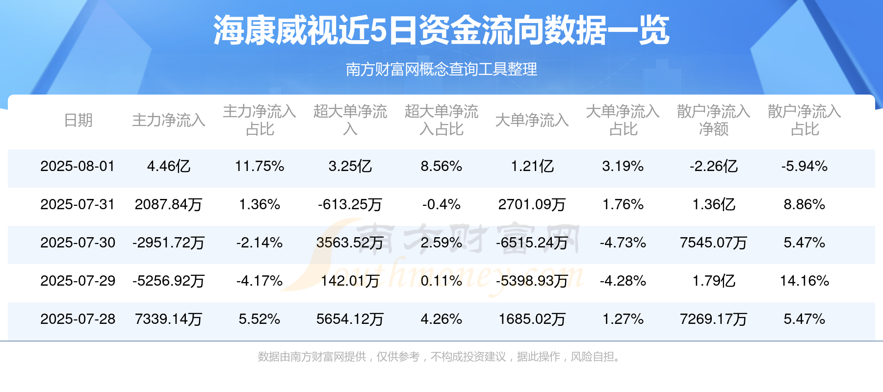 8月1日该股主力资金净流入4.46亿元,超大单资金净流入3.25亿元,大单资金净流入1.21亿元,中单资金净流出2.2亿元,散户资金净流出2.26亿元。