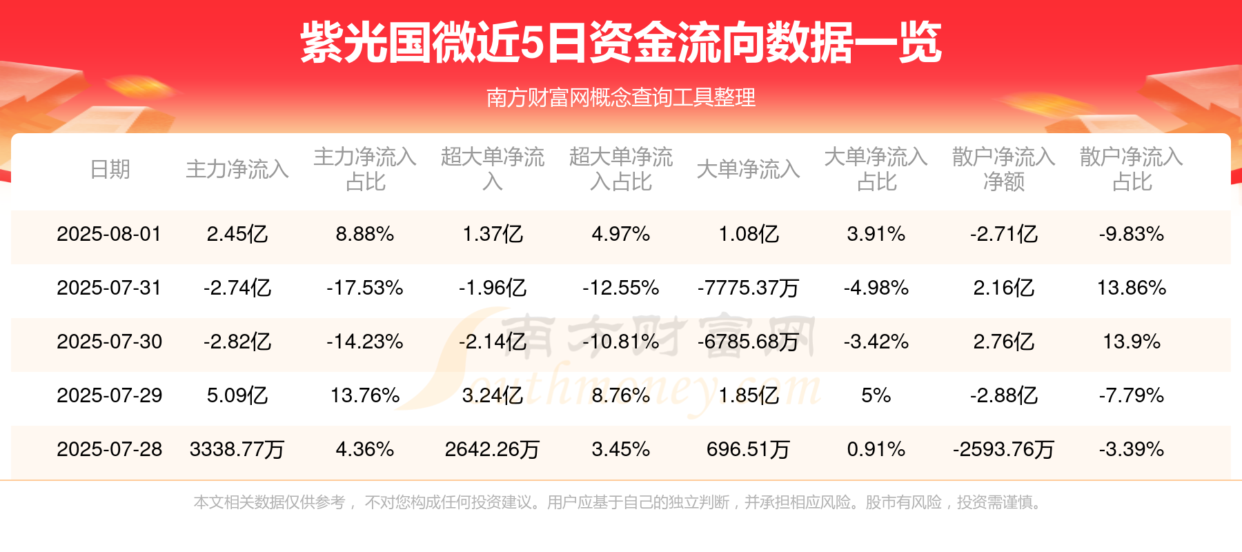8月1日消息,紫光国微8月1日主力资金净流入2.45亿元,超大单资金净流入1.37亿元,大单资金净流入1.08亿元,散户资金净流出2.71亿元。