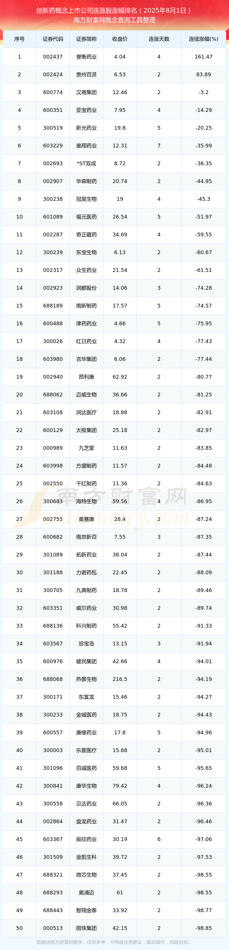 2025年8月1日创新药概念上市公司连涨股涨幅排名