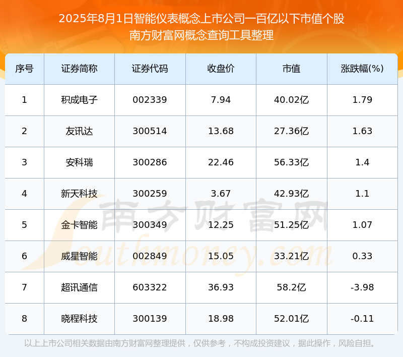 截止2025年8月1日,智能仪表概念上市公司市值一百亿以下的个股共有8只。其中,市值较高的有超讯通信、安科瑞、晓程科技,市值分别为58.2亿元、56.33亿元、52.01亿元。