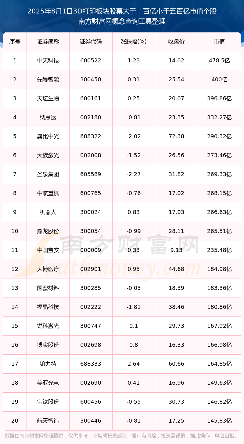 截止2025年8月1日,3D打印板块股票市值大于一百亿小于五百亿的个股共有33只。其中,市值较高的有中天科技、先导智能、天坛生物,市值分别为478.5亿元、400亿元、396.86亿元。