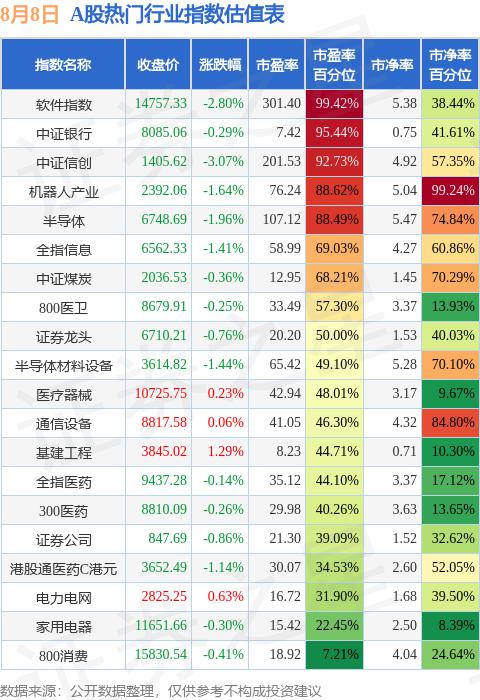热门行业指数方面,软件指数的市盈率百分位较高,为99.42%。而800消费的市盈率百分位较低,为7.21%。