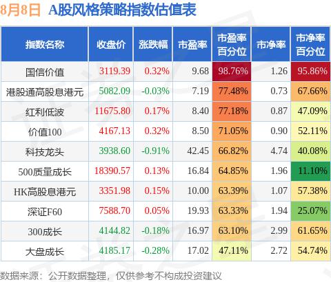 风格策略指数方面,国信价值的市盈率百分位较高,为98.76%。而大盘成长的市盈率百分位较低,为47.11%。
