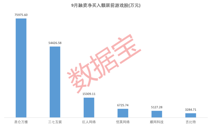 证券时报·数据宝梳理了9月(截至9月23日)融资净买入额居前的游戏股,供读者参考。其中,融资净买入额超1亿元的个股有3只,分别为昆仑万维 data-match-index=0>昆仑万维、三七互娱、巨人网络,对应金额依次为7.6亿元、5.44亿元、1.53亿元。