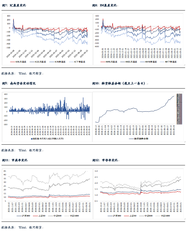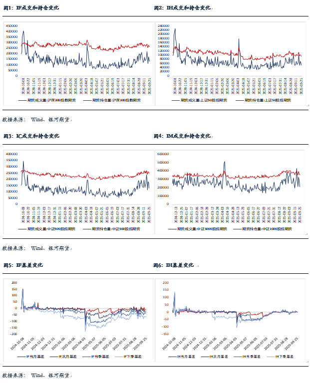股指期货随现货分化,至收盘,主力合约IH2512涨0.52%,IF2512涨0.88%,IC2512涨0.43%,IM2512跌0.09%。基差表现较为稳定,小幅波动没有明显趋势。IM、IC、IF和IH成交分别下降27.5%、26.8%、9%和16.6%;IM、IC和IH持仓分别下降3.3%、2.8%和3.4%,IF持仓增加1%。