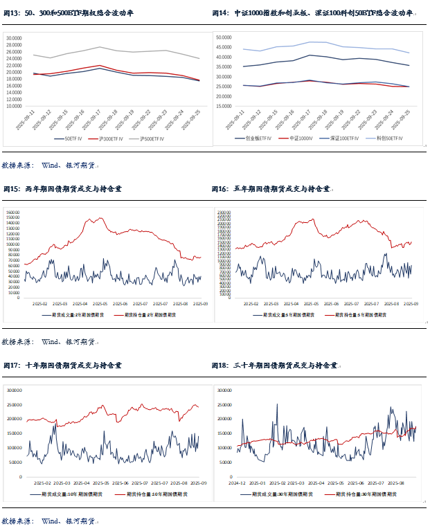 期权方面,今天期权标的普遍波动有限,同时ETF期权9月合约昨日到期,今天各个期权品种成交量回落幅度较大。品种上看,创业板ETF期权成交相对活跃。波动率方面,多数期权品种隐波震荡回落。近期市场情绪切换频繁,隐波与标的相关性不稳定,且隐波弹性较高。