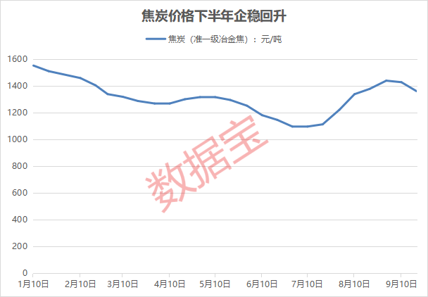 受供需矛盾和焦煤价格下跌影响,上半年焦炭价格明显下跌,下半年以来表现较好。期货价格1—5月连续下跌,累计跌幅达27.78%,6月开始反弹,截至最新报价1716.5元/吨,6月以来累计上涨24.85%。焦炭现货价格自7月开始反弹,国家统计局数据显示,9月中旬焦炭(准一级冶金焦)价格为1360.7元/吨,较6月末1096.4元/吨的低点上涨24.11%。
