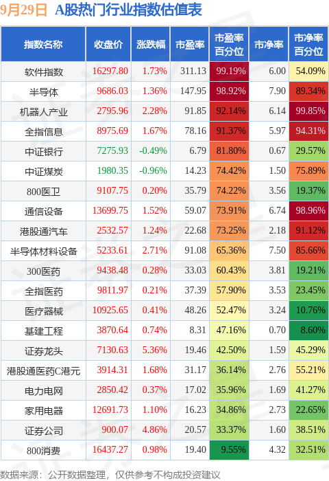 热门行业指数方面,软件指数的市盈率百分位较高,为99.19%。而800消费的市盈率百分位较低,为9.55%。