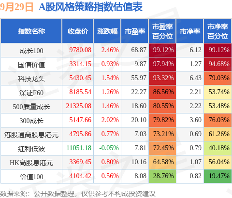 风格策略指数方面,成长100的市盈率百分位较高,为99.12%。而价值100的市盈率百分位较低,为28.76%。