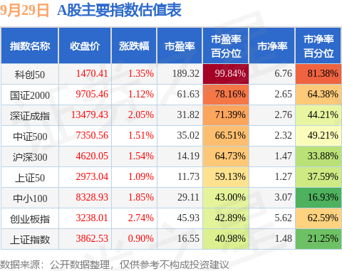 A股主要宽基指数方面,科创50的市盈率百分位较高,为99.84%。而上证指数的市盈率百分位较低,为40.98%。