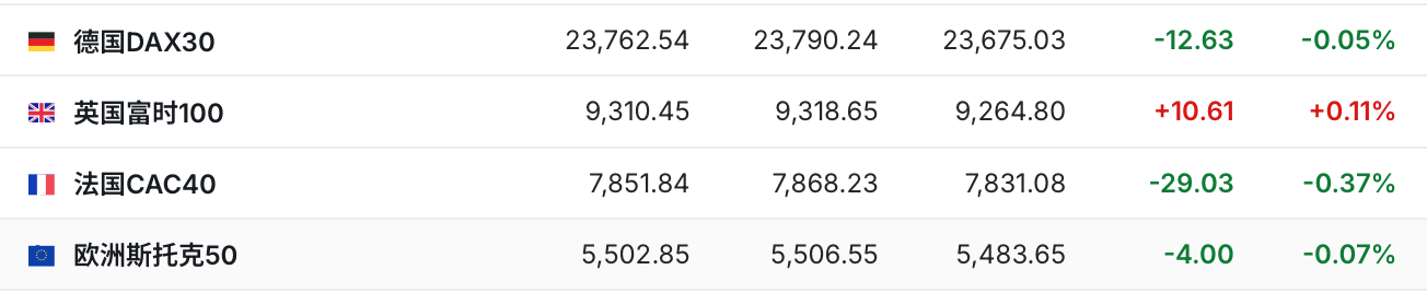 2.截至发稿,德国DAX指数跌0.05%,英国富时100指数涨0.11%,法国CAC40指数跌0.37%,欧洲斯托克50指数跌0.07%。
